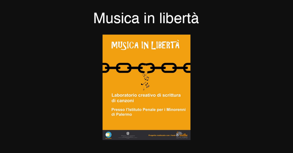 Musica in Libertà è un progetto sociale destinato ai ragazzi dell’Istituto Penale per i Minorenni di Palermo svolto attraverso Arte e Musica per la conoscenza di sé. Finanziato dall’8 x mille della Chiesa Valdese, questo percorso è stato guidato da esperti del settore musicale che hanno lavorato a stretto contatto con i ragazzi dell’Istituto Malaspina conducendoli alla scrittura di diverse canzoni e alla realizzazione di un video: “Fiori dal nulla”.